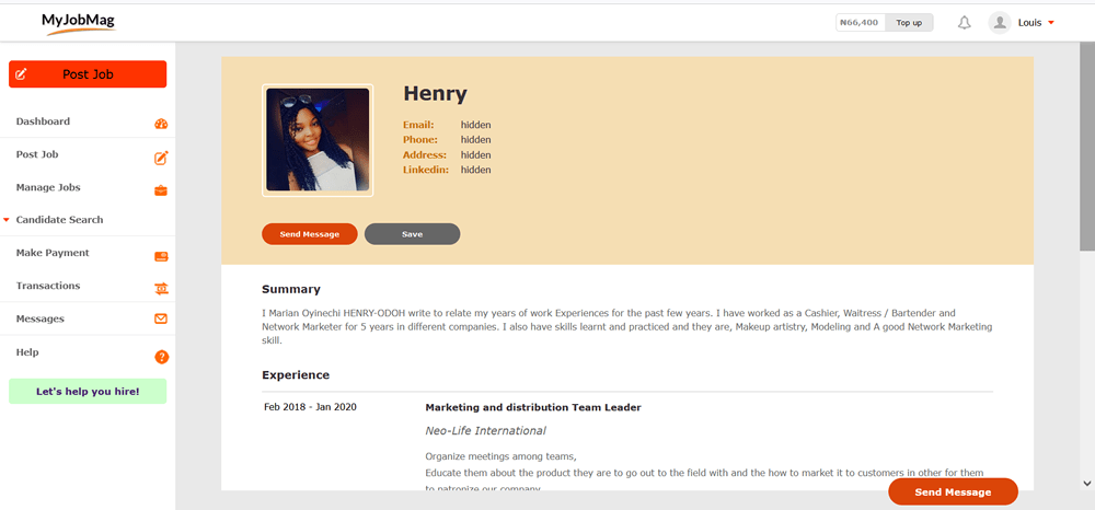 Our candidate search is free to use at this time. You can search, view and message candidates on MyJobMag at no cost to you. You only pay if you want to view candidate's phone number and email.